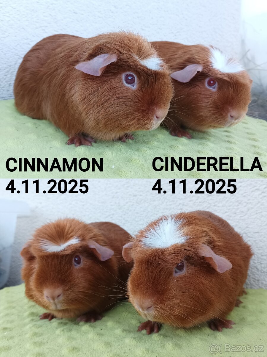Chovatelská stanice morčat Crazy Cavia nabízí dvě samičky - sestry v barvě zlatá s bílou, saténová srst.