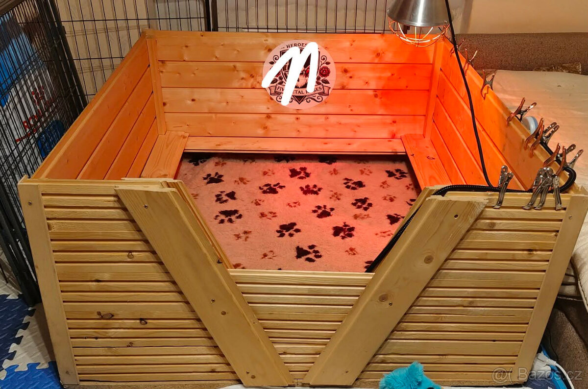 Prodám krásnou dřevěnou porodní bednu pro psy, rozměr: 1,2x1,2x0,6m, má protizalehávací zábranu, nastavitelnou výšku vstupu,podlaha porodní bedny je překližka s pěnovými puzzly.