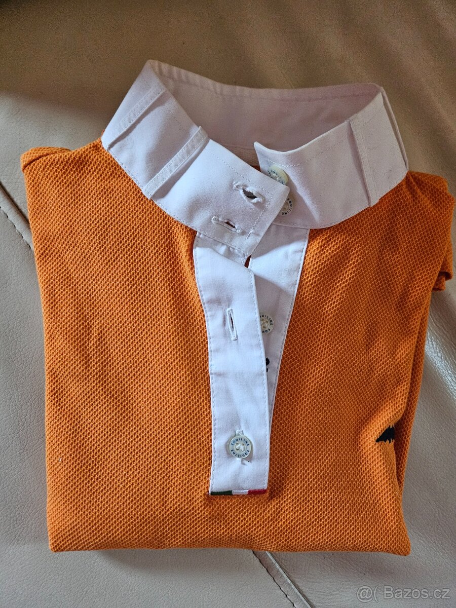 Prodám závodní triko Equiline oranžové ve vel.34/36/xs/s (IT40), původní cena 1.900,-. Rozměry: od ramene dolů 55 cm, zadova délka bez límečku 56 cm, přes prsa 2x40 cm. Cena nyní 700,-