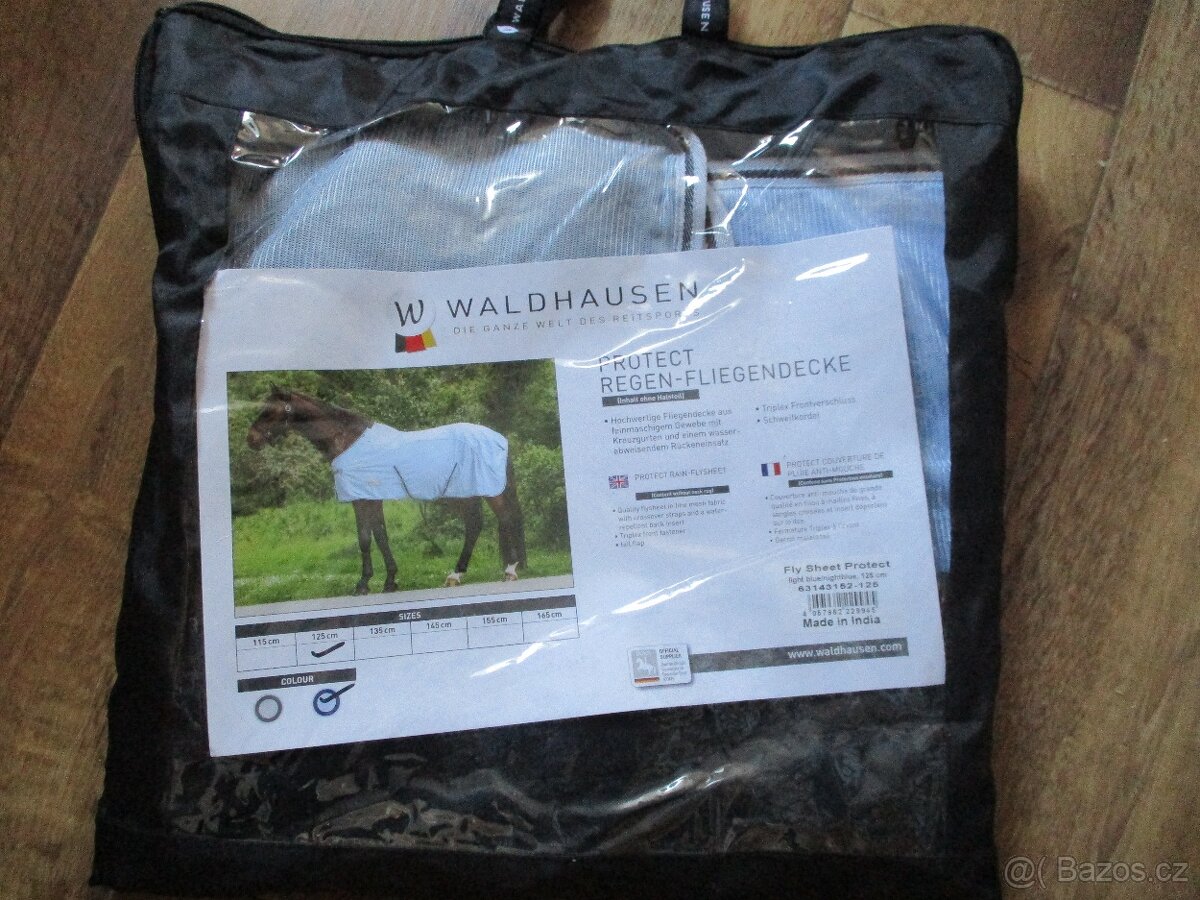 Prodám letní deku proti hmyzu Waldhausen - Fly Sheet Protect ve velikosti 125 cm. Kvalitní deka proti mouchám z jemné síťoviny s křížovými popruhy pod břichem a nepromokavými zády. Zapínání vepředu nastavitelné na karabiny, podocasník a popruhy mezi zadní nohy zajišťují, že dobře sedí. S kroužky pro uchycení krčního dílu. Barva světle modrá-tmavě modrá. Deky jsou volné ve stejné velikosti 2 kusy. Cena je za kus .