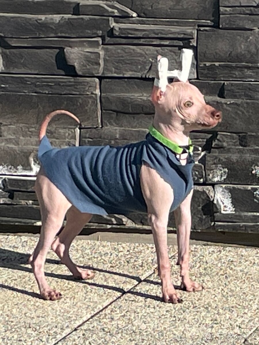 Anthoni je nádherný malý psík so zamatovou pokožkou s jednoliatym sfarbením, úplne bez chlpov, s predispozíciou a predpokladmi na úspešnú výstavnú budúcnosť
