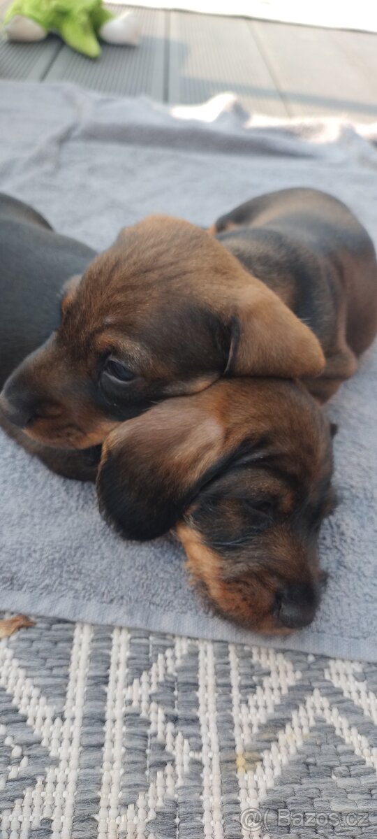 Nabízíme štěňata jezevčíka drsnosrstého trpasličího/králičího, s PP, 2 psi, stáří 6 týdnů, k odběru od 17.4. 2026. Matka: Katty od Skontických drsňáků, Otec: Art z Kačákovy samoty. Oba rodiče výstavně i pracovně úspěšní, štěňata budou socializovaná, očkovaná, čipovaná, odčervená.