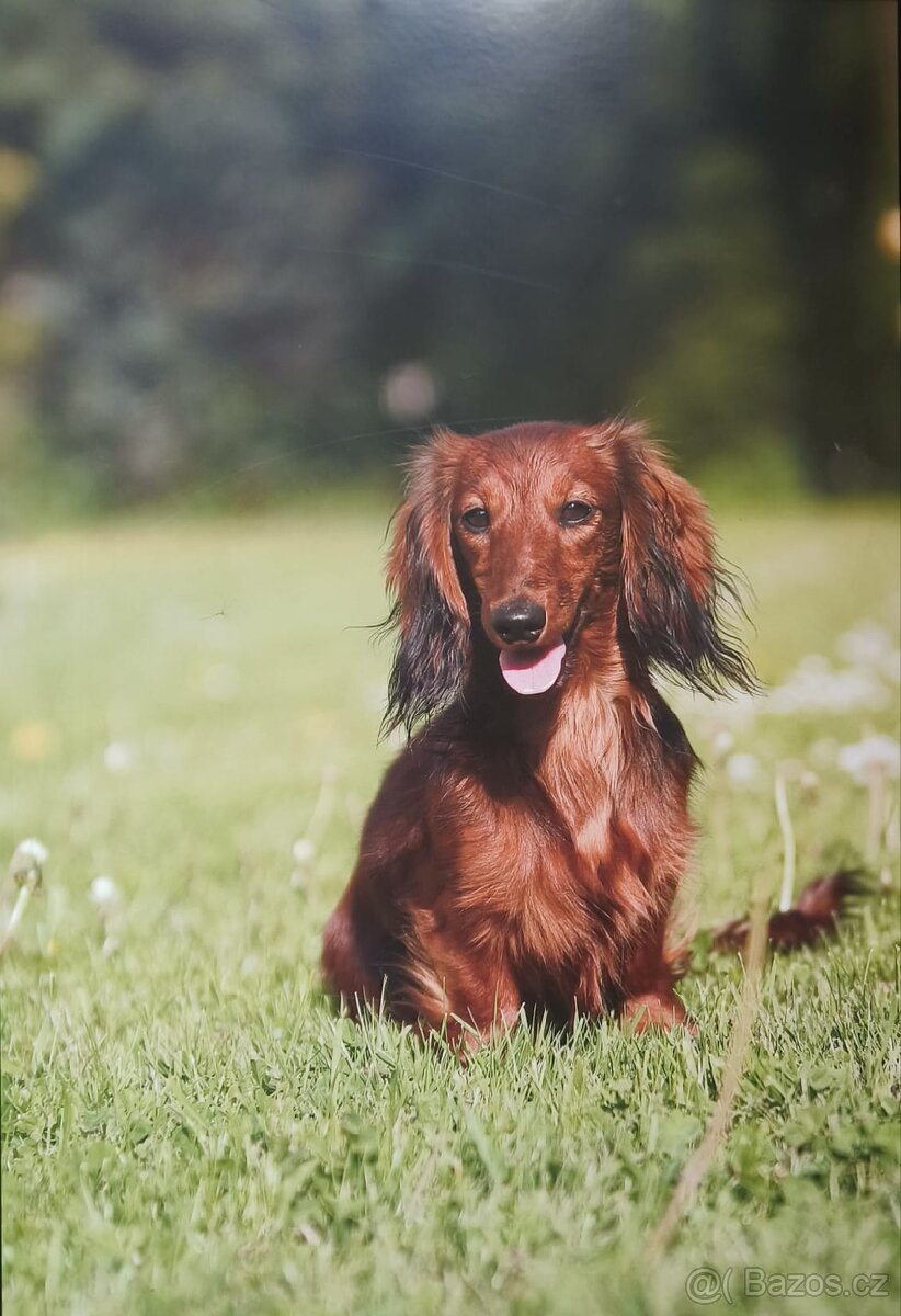 Koupím fenku jezevčíka dlouhosrstého trpasličího v barvě červené s černým pálením.