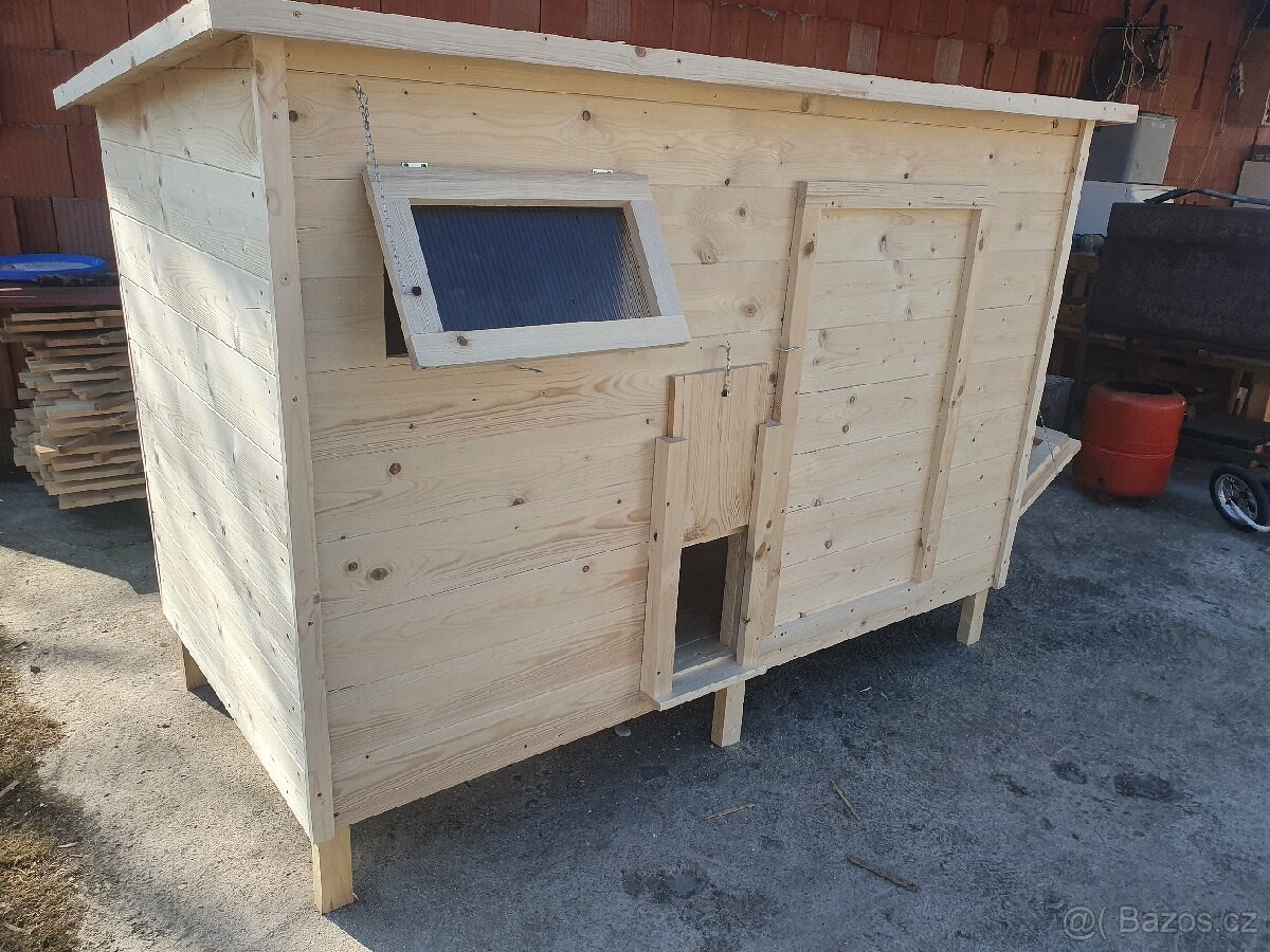 Kurnik pro slepice - [25.4. 2026]Nabízím vyrobu kurniku pro slepice.Rozměry jsou 190x100, přední výška 125cm.Boční schůdky,dvoje dvířka,3x snášedla,2 hřád, pro snadné čistění odklopeni poloviny zad nebo varianta s bočním čistěním