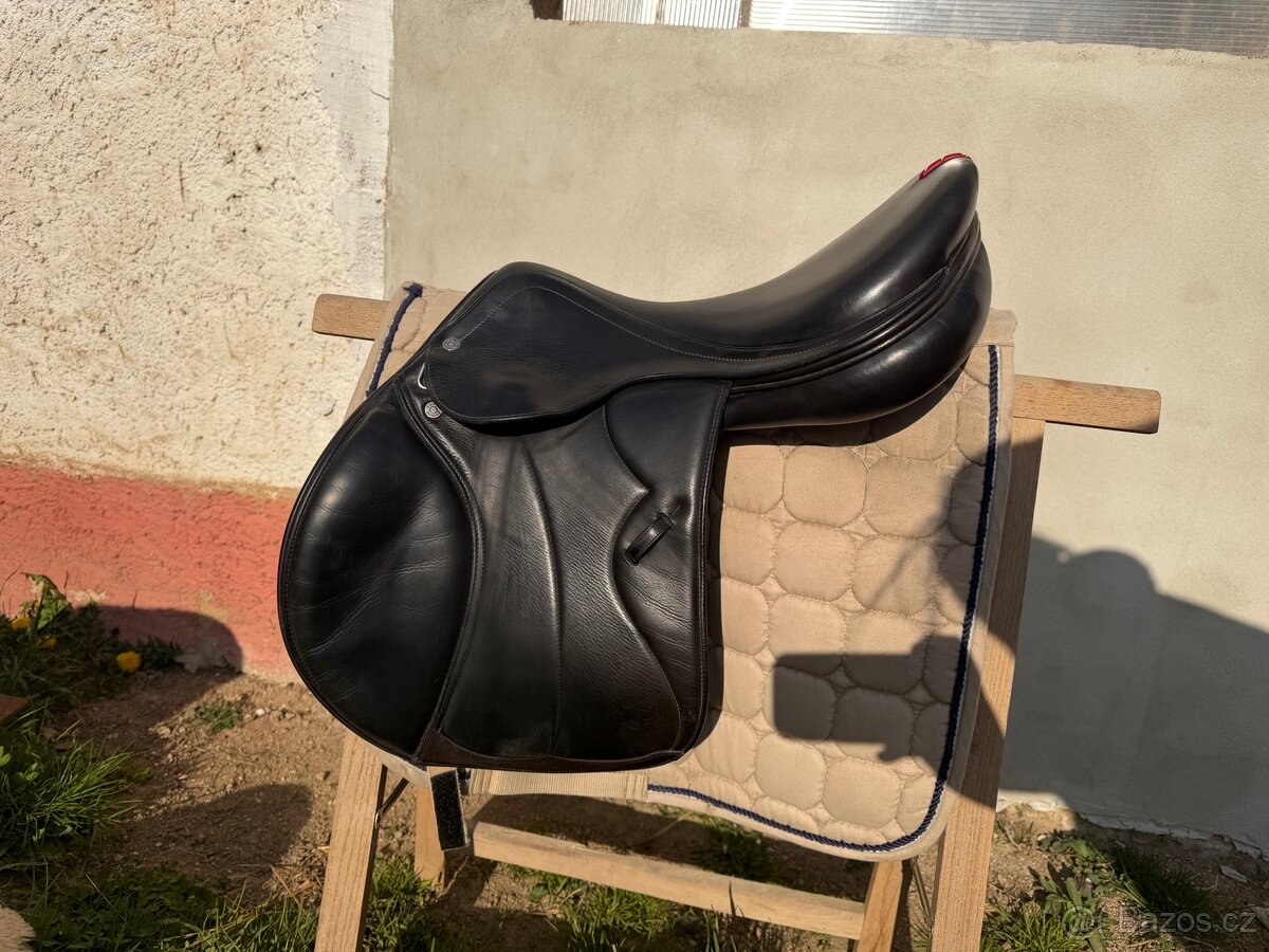 Prodám černé skokové sedlo Equipe, v moc pěkném stavu, viz foto. 17" posedlí, komora 33, sedící na širší hřbet.