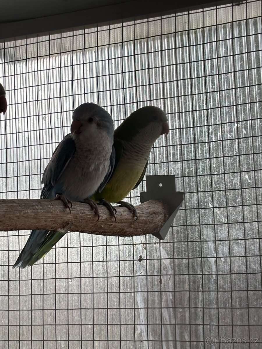 Prodám chovný pár mníšků šedých stáří 3 roky samec zelený a samice modrý Opalín cena dohodou zájemci prosím pouze SMS 720040002