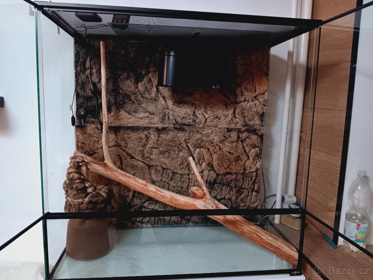 Prodám použité terárium po chameleonovi. Celkově je v pěkném, nepoškozeném stavu. Terárium je plně vybaveno, součástí pozadí, osvetleni, teploměr, vlhkoměr, vodopád. Rozměry D90xH45xV90cm. Tel. 602110859. Cena 5000kč.