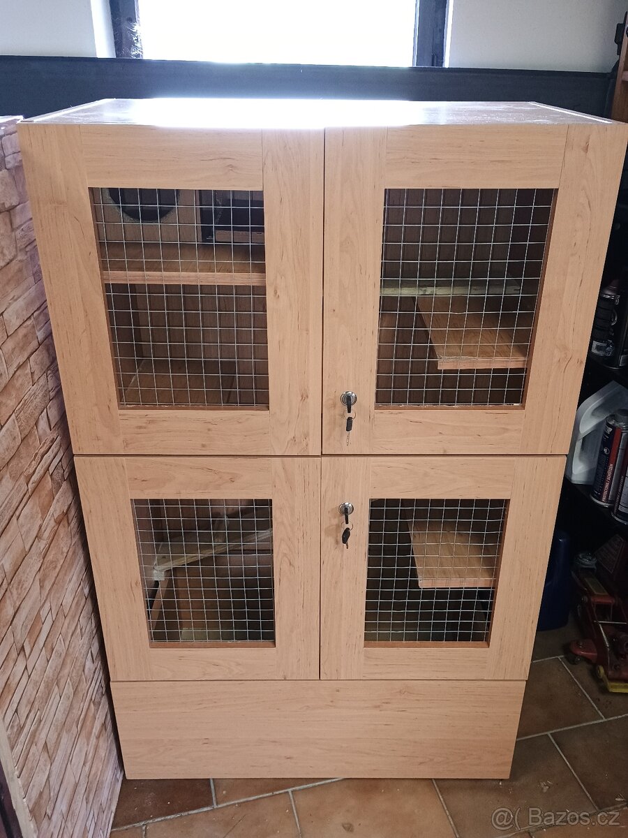 Prodám klec pro činčily dělaná na míru, výsuvný šuplík pro podestýlku.Šířka je 80 cm hloubka 47cm výška 130cm.