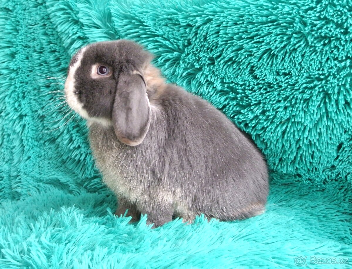 Minilop - sameček - [12.4. 2026]Minilop sameček, typový, s modrýma očima. Zvyklý na ruku a častý kontakt.