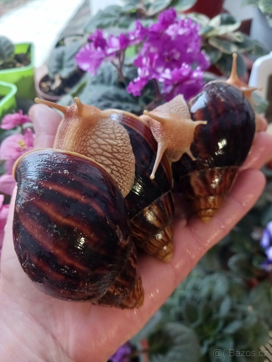 Zdravíme všechny milovníky africkych sneku. Jsme odrostlejší mladatka africkych sneku druhu Lissachatina immaculata immaculata,vylihli jsme se v poslední týden v zari 2025,měříme 8,5 cm v ulitě. Prošli jsme trojnásobnou selekci. Dobre papame. Máme radi: bataty,cuketu,kukuřici lilek,petrzel ,zampiony,jablíčka ,listy pampelisek a jitrocelu. Chutná nám také gamarus,ten máme nejraději. Dostáváme ho mletý jednou týdně a k tomu mletý vápenec a sepiové kosti také vajecnych skorapek každý den jako posyp na stravu. Dále pak dostáváme vitamínové směsí,pro růst,zdraví a vitalitu. Všechny doplňky, na ktere jsme zvykli u nas Jsme z druhů šnečků, kteří jsou kontaktní s člověkem, jsme zvyklí na dotyk. Hledáme nové domovy a těšíme se na nové paničky. Není problém poslat,jen nesmí mrznout.V zime doporucujeme dokoupit topny sacek,ktery u nas sezenete. Pri zájmu nám prosíme nejdřív napište. Dekujeme a těšíme se na vás.