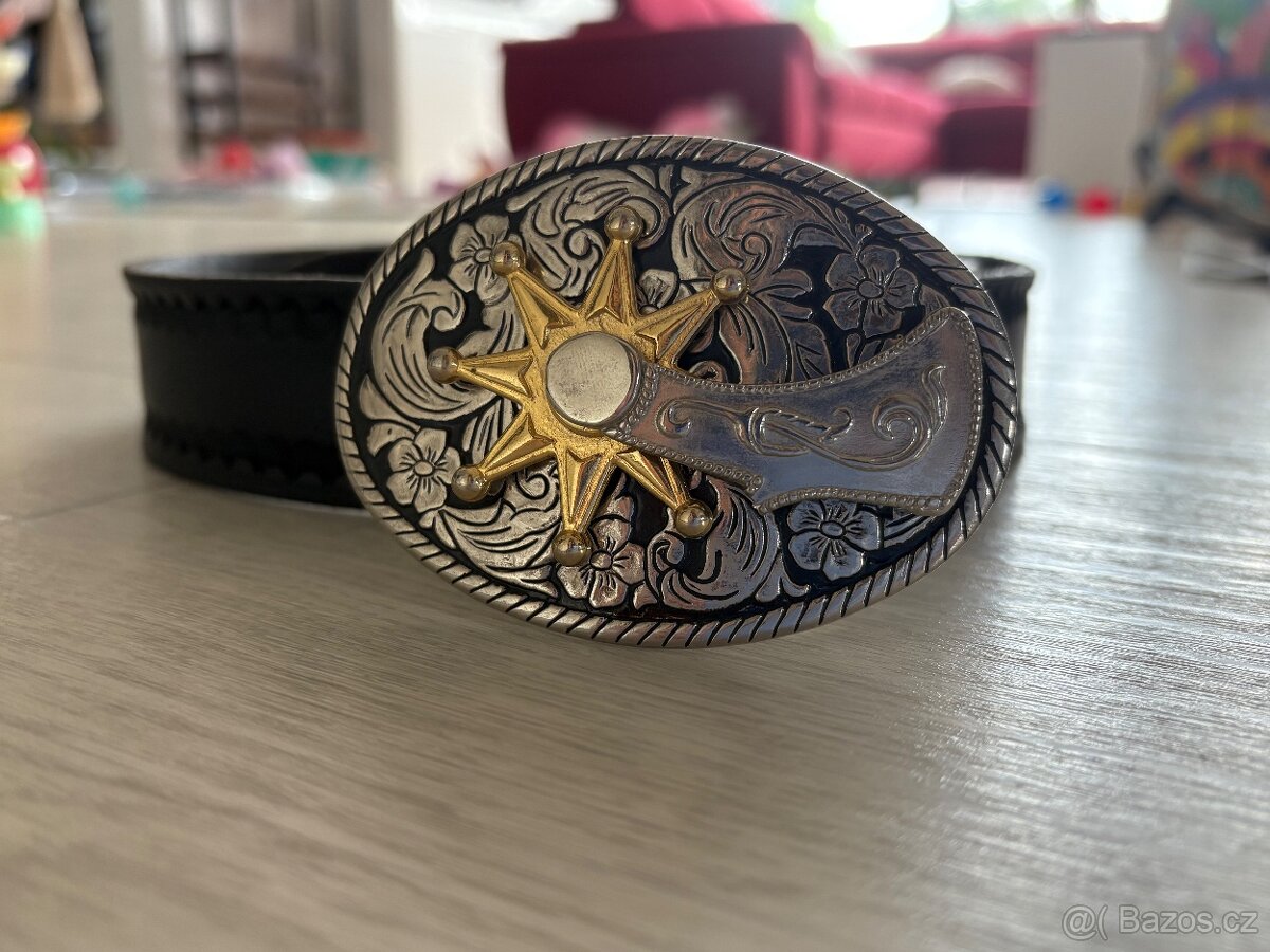 Prodám černý kožený pásek se zdobením, spona s ostruhou, která se točí (zlatá část se točí). Délka koženého pásku 105 cm, včetně spony celková délka 112 cm.