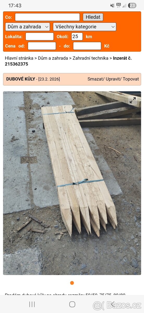 Nabízím dubové nebo modřínové kůly - TOP - [30.3. 2026]Prodám dubové štípané kůly vhodné na oplocenku, ohradu, plot.