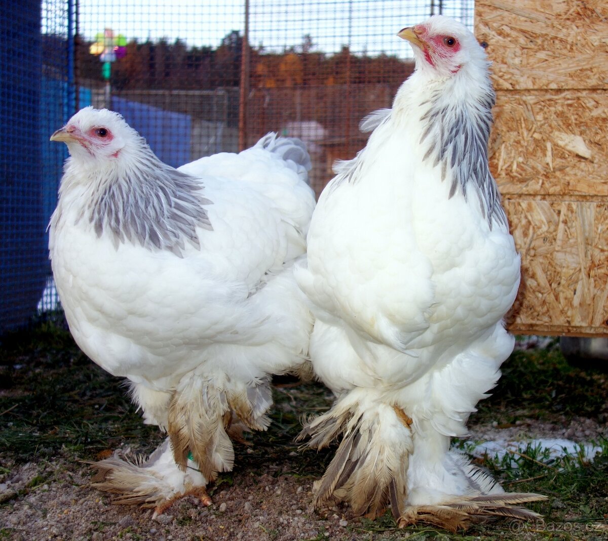 Brahmánka velká kmen - [22.4. 2026]Nabízím nepříbuzný kmen 1,2 brahmánky velké bílé černě kolumbijské. Kohout líhnutý 03/25 z NV z Belgie, jednou vystavený a oceněný 95b. Slepičky líhnuty 06/25, nekroužkované - mají trochu červeného pepření, občas se mi to takto vyštěpí ač jsou rodiče ...