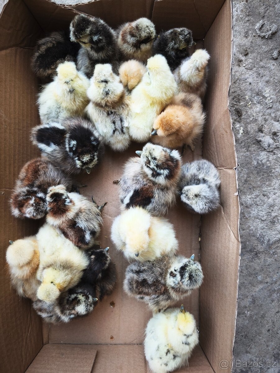 Kuřata hedvábničky - [24.4. 2026]K dispozici kuřata hedvábničky velké a zdrobnělé. Stáří 1 týden. Cena 150 kč/ks