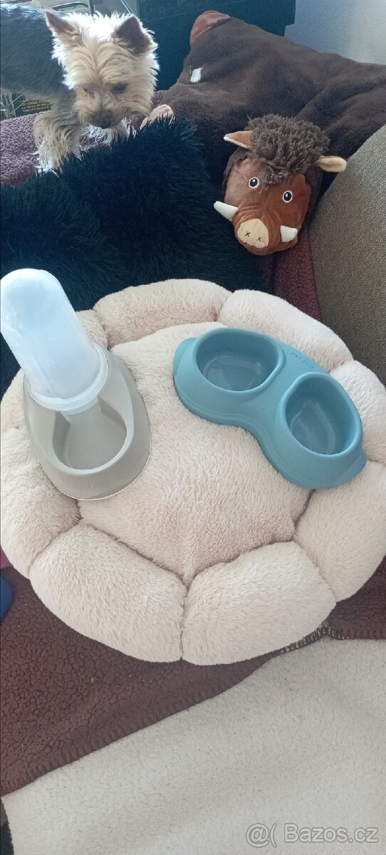 Pelíšek,zásobník na vodu+misky pro malého pejska, např . jorkšírský teriér, čivava, pražský krysařík, nebo štěně.Vše top stav. Při platbě předem zašlu přes zásilkovnu. Podívejte se na mé další inzeráty