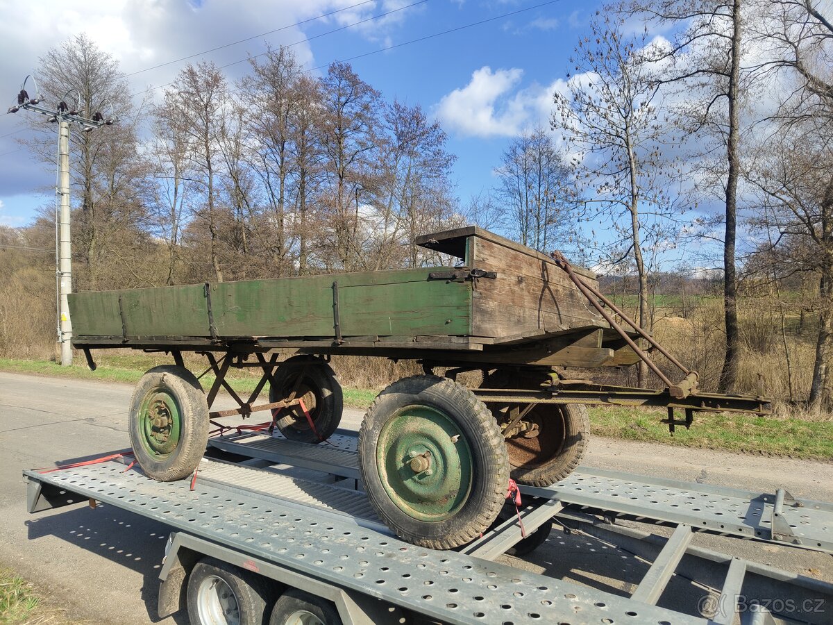 Nabízím vlečku za koně. Stav odpovídá stáří. Nutné vyměnit nějaké prkno. Skladováno pod plachtou. Kola pěkná, točí se lehce. Konstrukce bytelná a funkční.