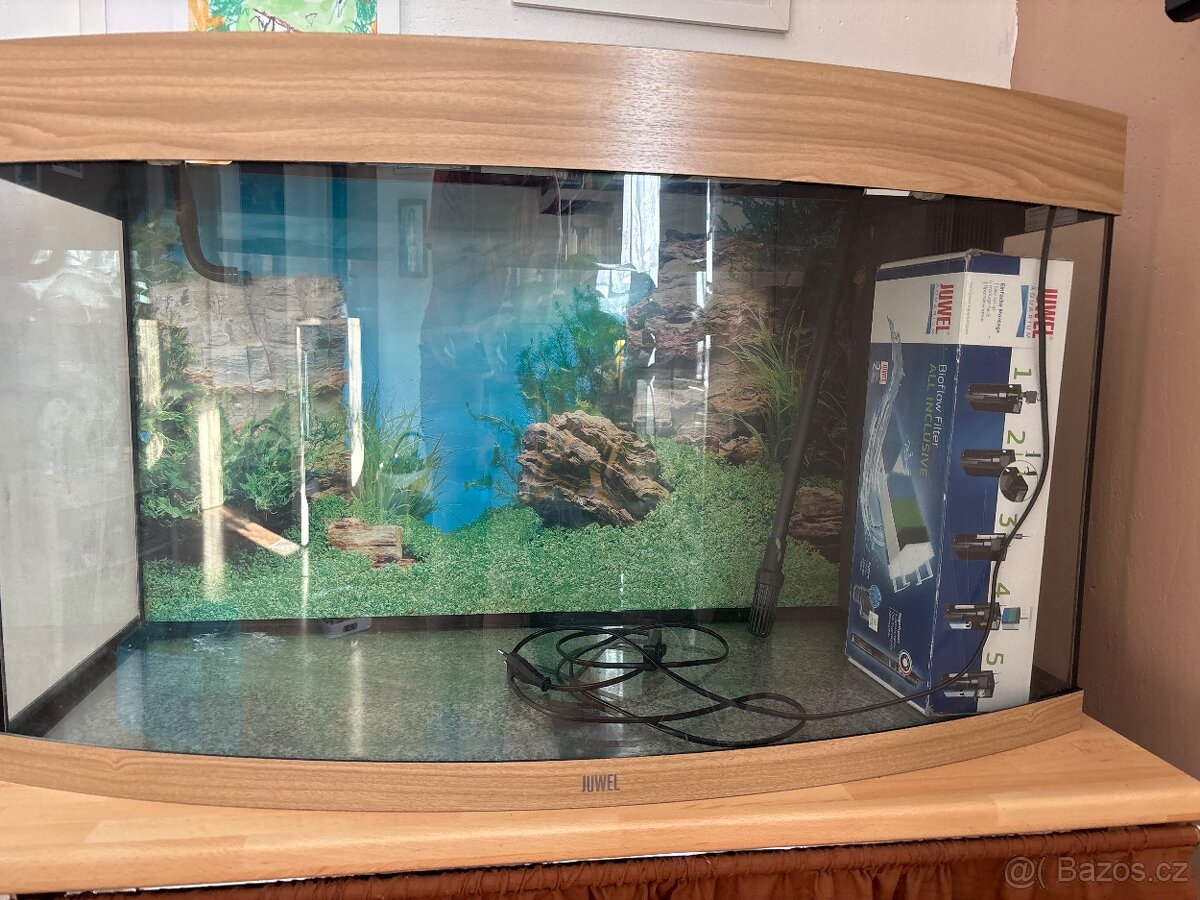 Prodám akvárko rozměry 93 x 41 cm výška 55 cm v přední části zaoblené. S přídavným filtračním zařízením a stolkem. Cena 5500,- Kč