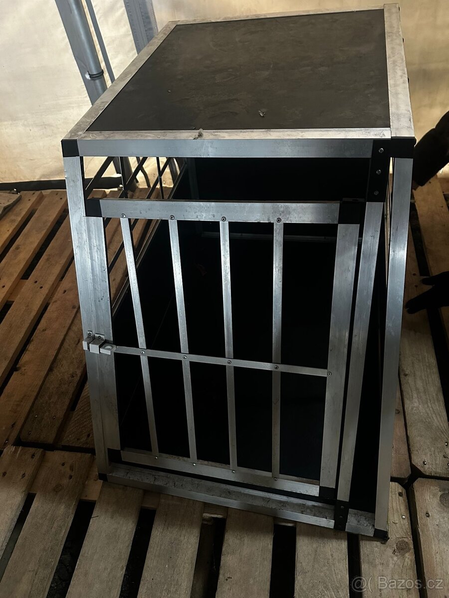 Tento předmět je hliníková přepravní klec pro psy do auta, která zajišťuje bezpečnou přepravu zvířat.