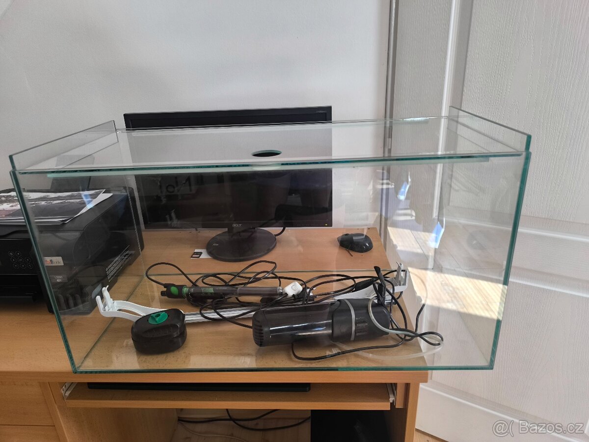 Akvárium, krycí sklo s otvorem pro krmítko a zkoseným rohem pro kabely, topení Tetra 75w,filtr Aquael fan2 plus,světlo Aquael leddy Slim 100w.