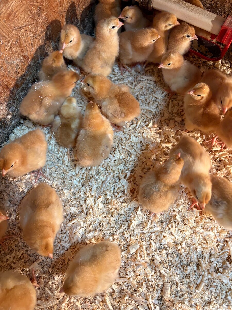 Nabízím 35 kuřátek Hempšírky. Vylíhnuté 25.4.2026. Pouze osobní odběr, ve středu 29.4.2026. 50 Kč za kus, každý další den + 1 Kč.
