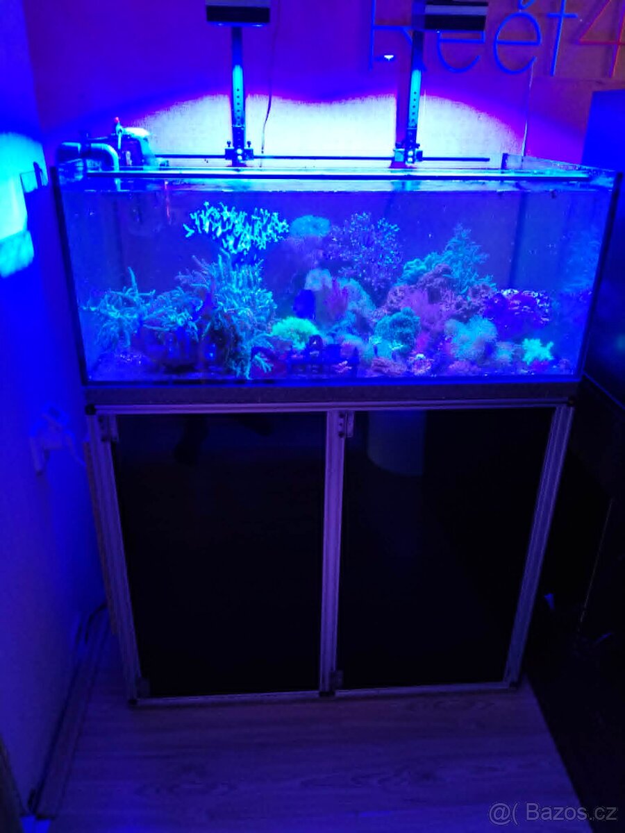 Součástí: 250l akvárium, 80l sump s posuvnými hradly na nastavení výšky hladiny, hliníkový rám z 2020 a 2040 profilů, potrubí, nevrtaný přepad BLAU.