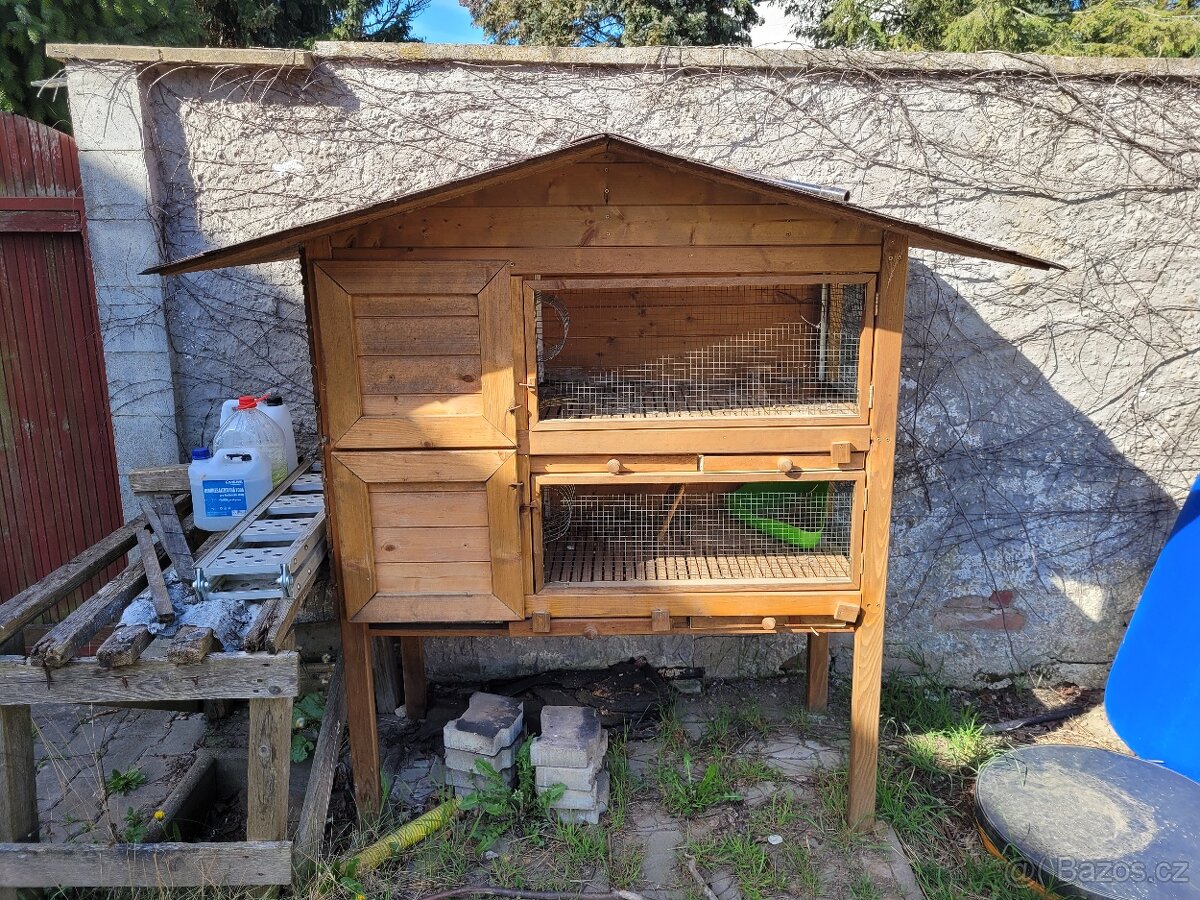 Dvoukotcová králikárna pro mazlíčky. Kotce se dají propojit a dá se otevřít i spodní kotec - měl jsme v plánu dát kolem nohou síť, aby mohli králíci i na trávu úplně ven, podle potřeby. Kotce jsou děrované s šuplíky na odpad. Výška 170cm, šířka 180cm včetně střechy. Dělal jsem před třemi lety, materiál 6500,-