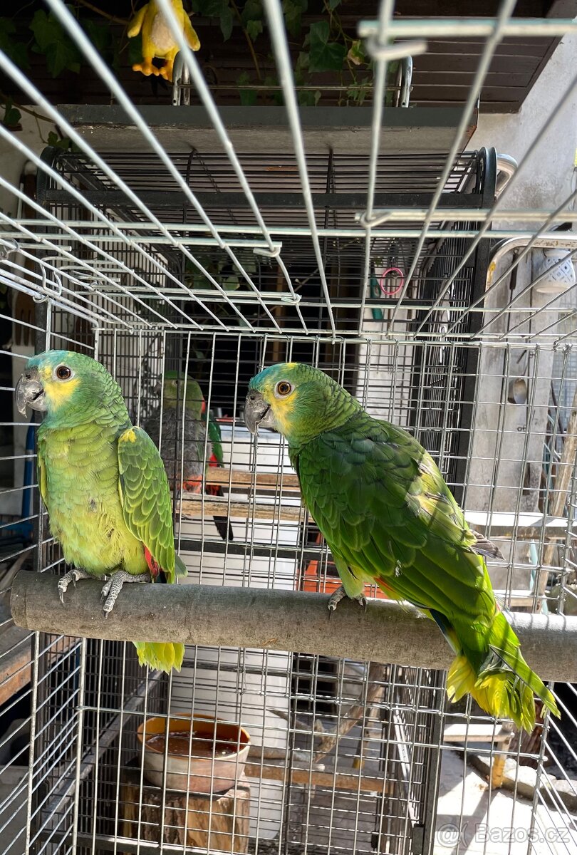 Amazoňan modročelý - [17.4. 2026]Prodám mláďata z roku 2025, druh : Amazoňan modročelý, na první fotce letošní mláďata vlevo samec (pohlaví určeno DNA) a nejspíš samice (jeho sestra, jsou příbuzní), nejsou kroužkovaní, nestihl jsem nakroužkovat včas, ale na jeden kroužek jsem mu nec ...